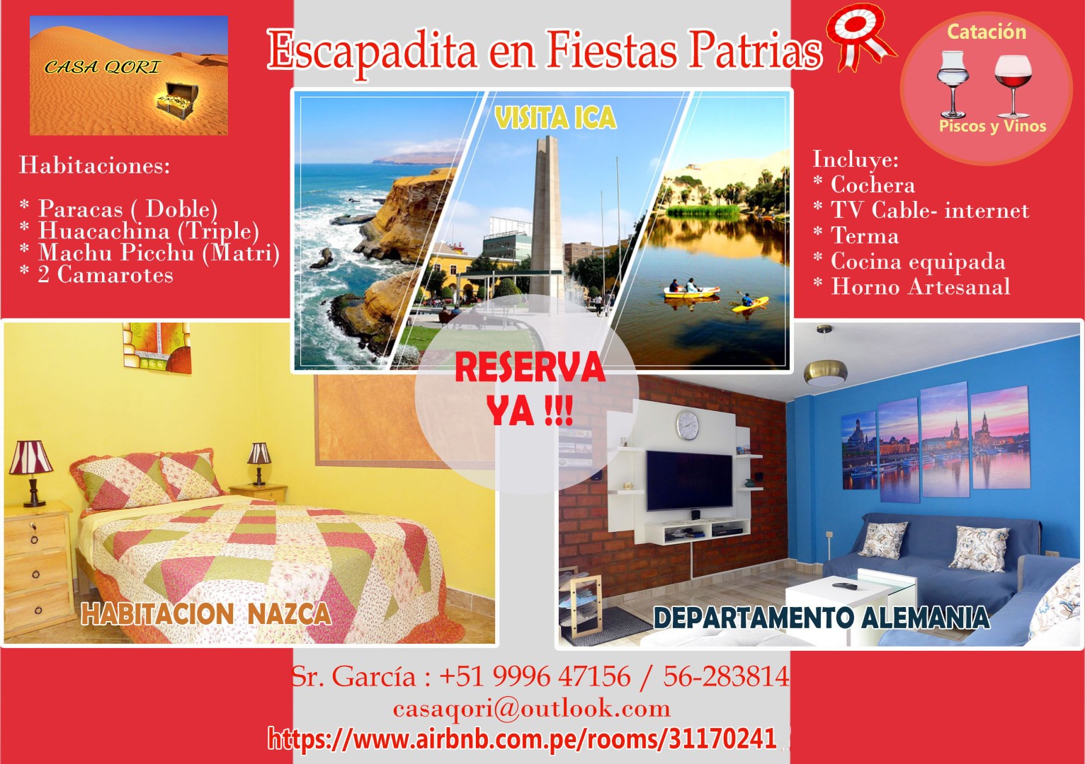 Para la cena en el hospedaje, pueden aprovechar nuestro horno casero, porque después de un buen chapuzón en Pisco o un paseo en la laguna Huacachina, comer carne horneada, con camote, papas y ensalada cerrando con broche de oro exquisito pisco o vinito de la casa. Les aseguro lllevarán de regreso una linda y alegre experiencia, que espero puedan recomendar!